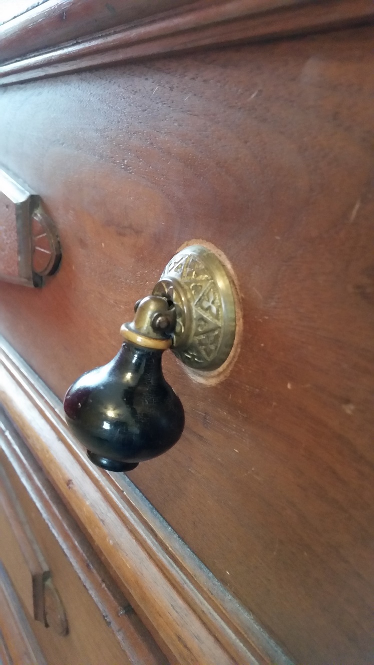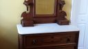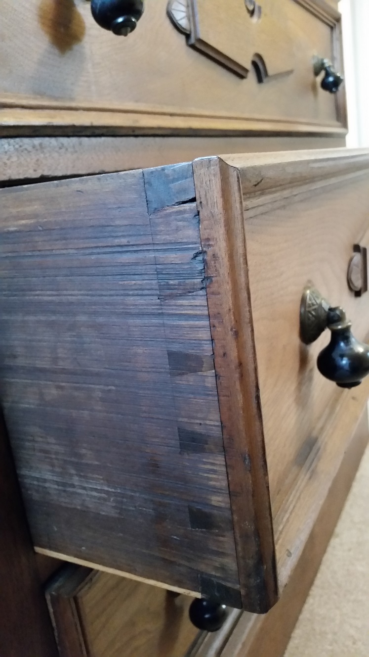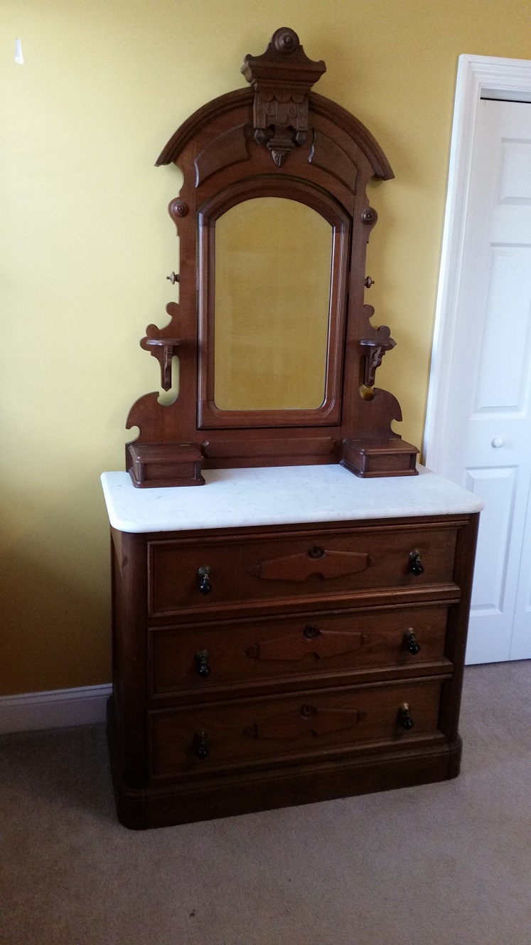 First off, apologies as I am antique illiterate and completely ignorant. I have some antique bedroom furniture of my grandmothers. I have no idea how old, who made it, or where it came from, although I suspect it is from her family. She was born 1917 and this stuff is probably older than that. Attached are some pictures of the dresser (is it even a dresser?). It is some species of wood (not laminate) with a marble top, and an original silver mirror. Original drop pulls and brass locks on all the drawers. Appears to have hand-cut, dovetail pins and tails (you can see the scribe lines). I have no idea if it’s worth $10 or $10,000. Any help would be greatly appreciated by this provincial rube who doesn’t know the first thing about old furniture.