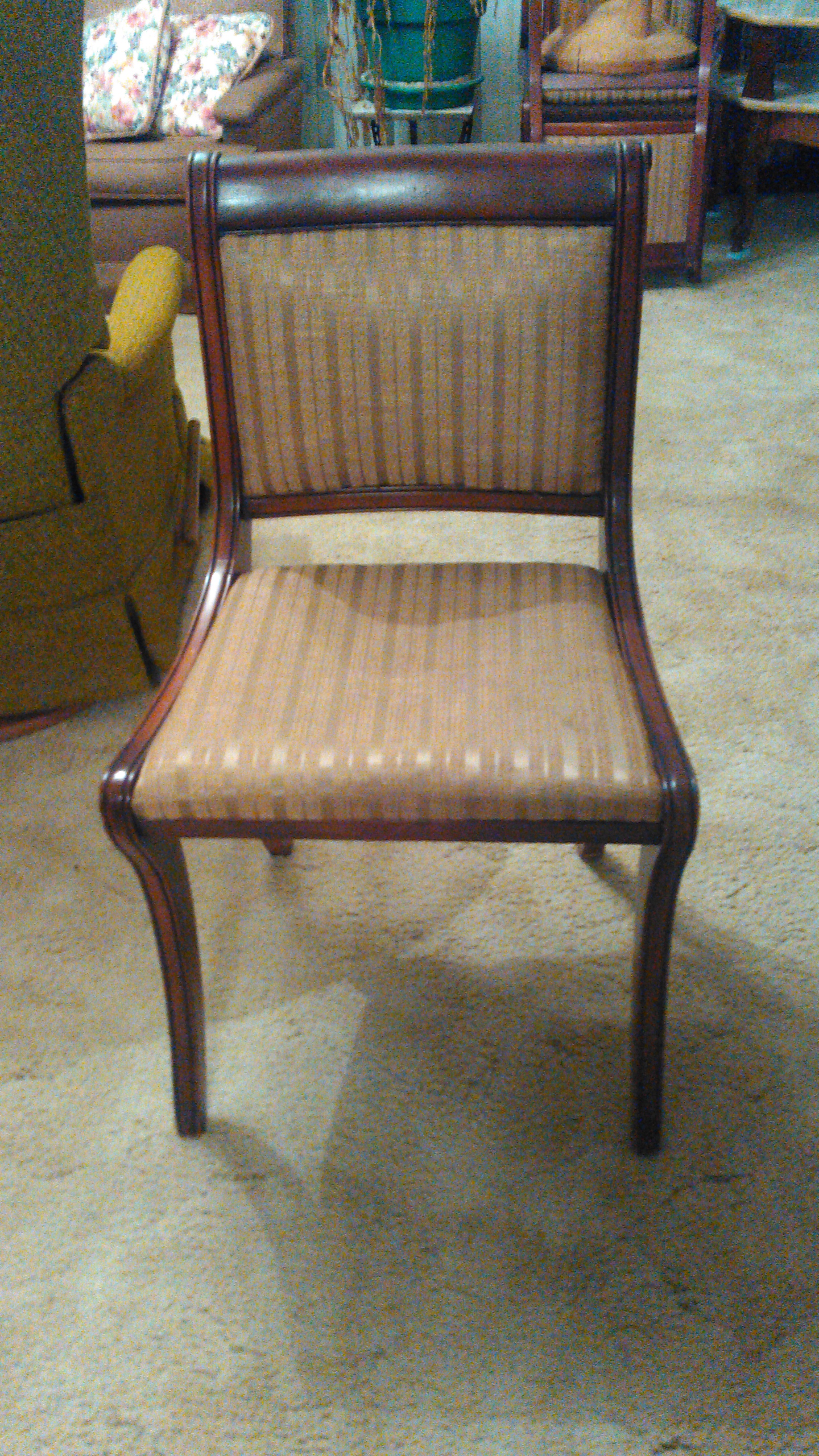 ParticipantThe table made of dense grained mahogany is in excellent condition. It was purchased in the mid 1950’s used by my husband’s parents. The table is 64 inches long, 42 inches wide and 29 inches tall. The table has 5 leaves each 12 inches wide. Table will expand to 74, 86, 98, 110 or 122 inches long with leaves. The Brass toe trestle style double legs split and expand to provide support when table is expanded. There are 6 chairs
