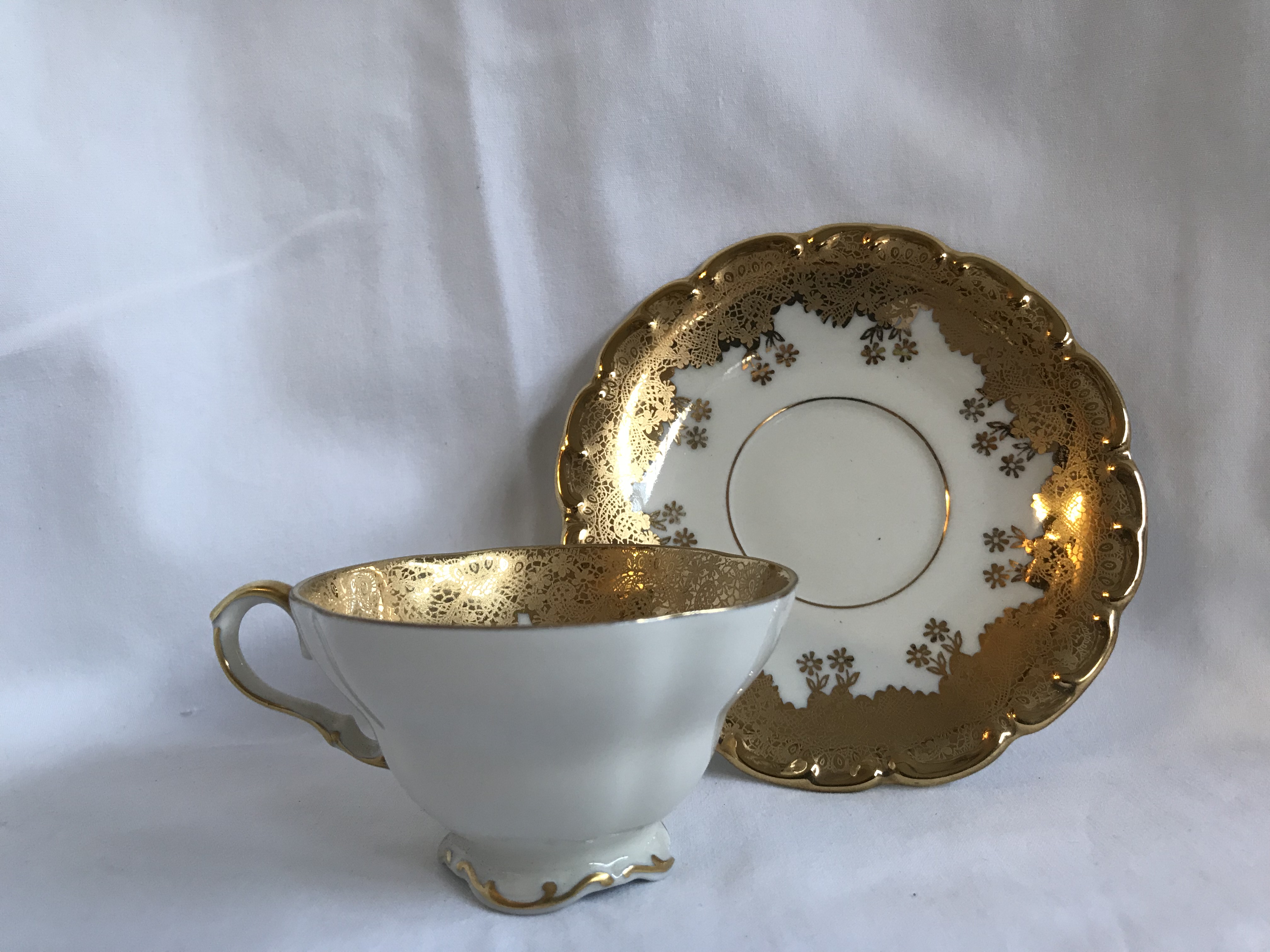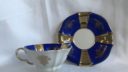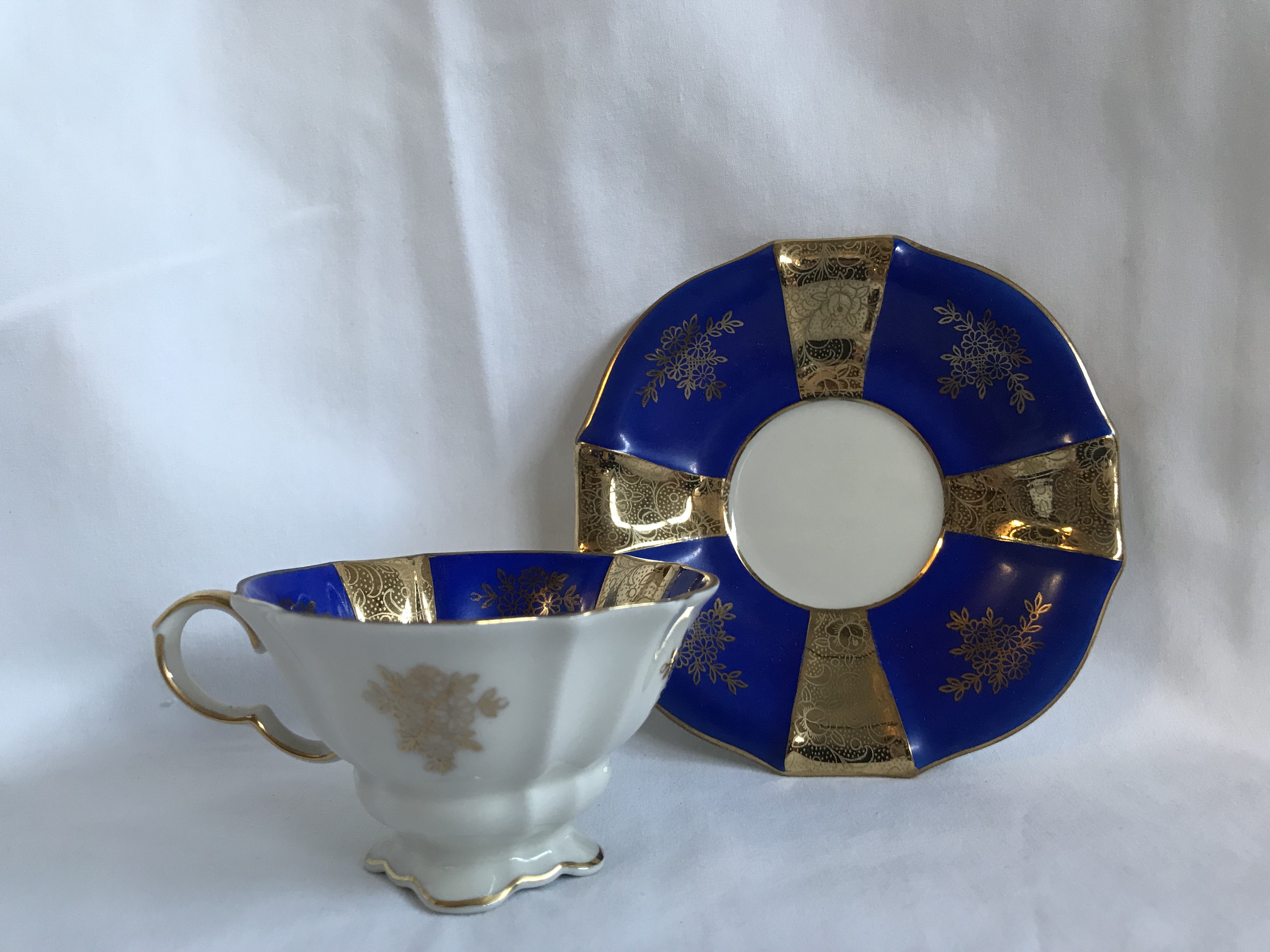 I am having trouble finding the pattern name for a few cups/saucers, which makes it difficult to determine their value. The first two are Lindner Kueps Bavaria. The Blue/White/Gold set is stamped with the numbers 196 and 0 at the bottom. The Gold/White set is stamped with the number 7. Both are from West Germany.