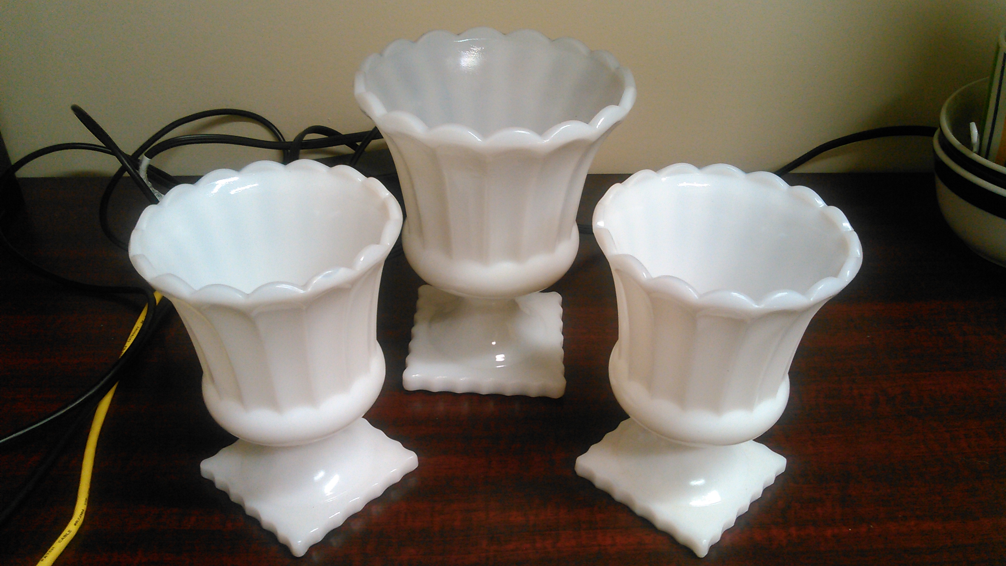 2 matching and 1 slightly larger milk glass vases/planters.