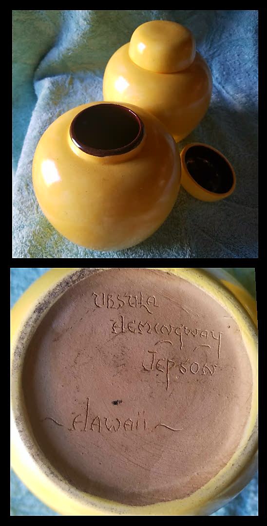Inherited a pair of matching vases with lids that were made by the granddaughter of Ernest Hemingway, Ursula Hemingway Jepson. Little information is available on her aside from her relation to her grandfather and that she succumbed to the”Hemingway curse”, and took her own life here in Hawaii in 1966.