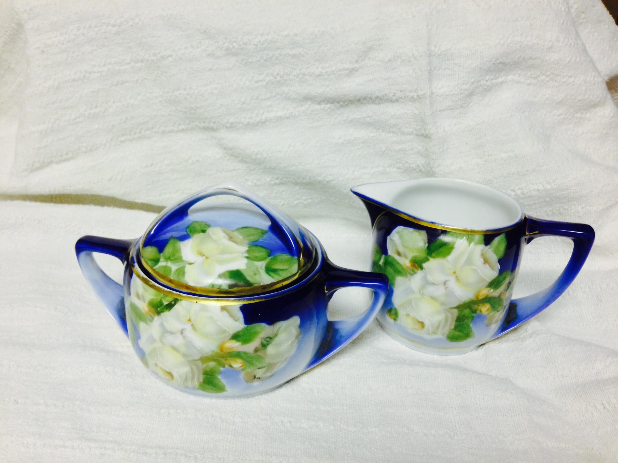 I am looking for help finding information on this creamer and sugar bowl. Can anyone tell me more about it? I found the name (Cobalt Blue with white rose) but the name Donatello is connected to various designs and does not seem to be an artist, what does that mean? Can someone tell me how old this is? Or can you tell me anything about these 2 pieces of china?