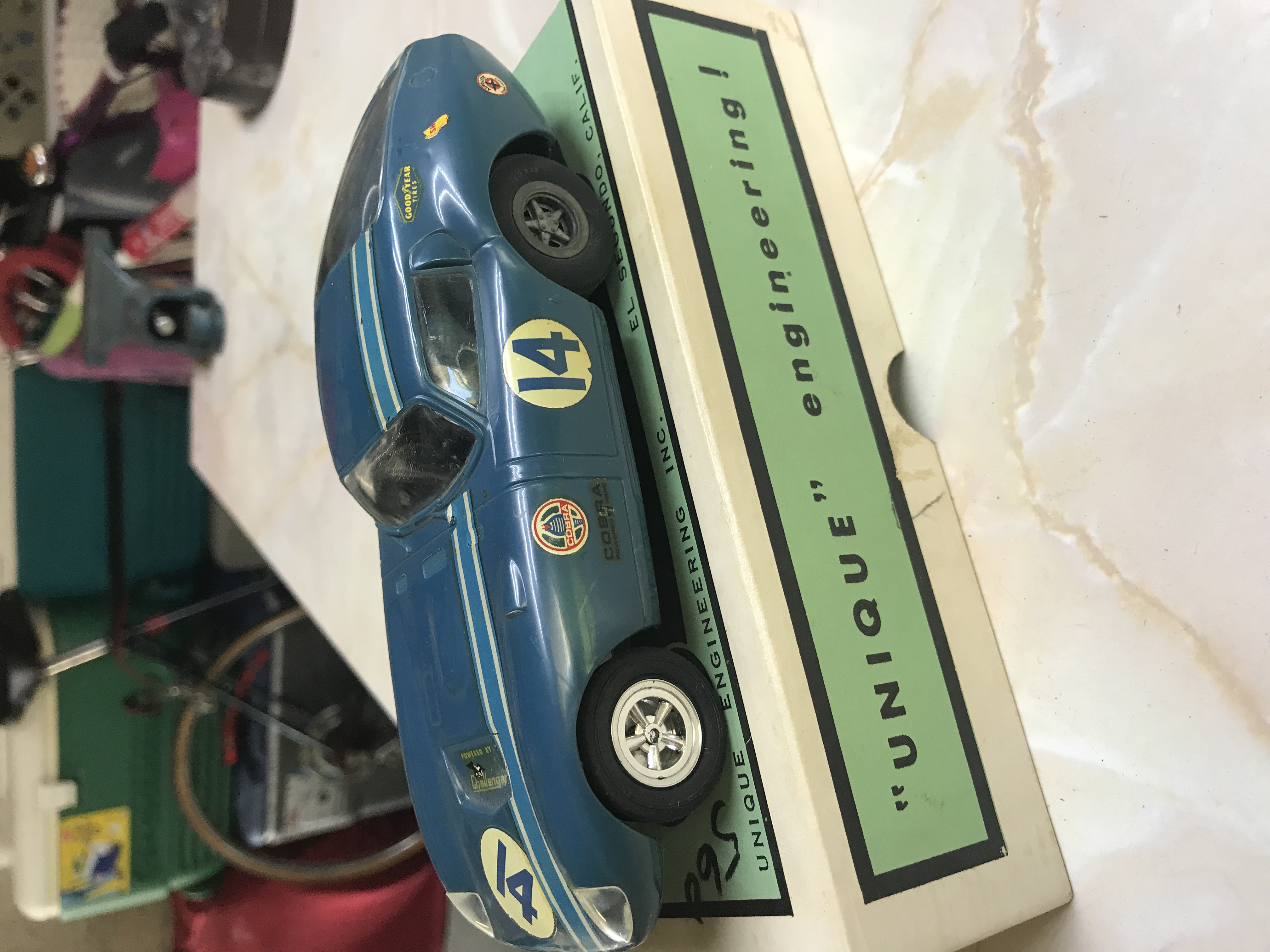 Tim ManasterskiKeymasterI believe your 1960s Ford Cobra slot car made by Unique Engineering is worth around $50-300 dollars. Here is a example of a similar slot car that sold in that price range: