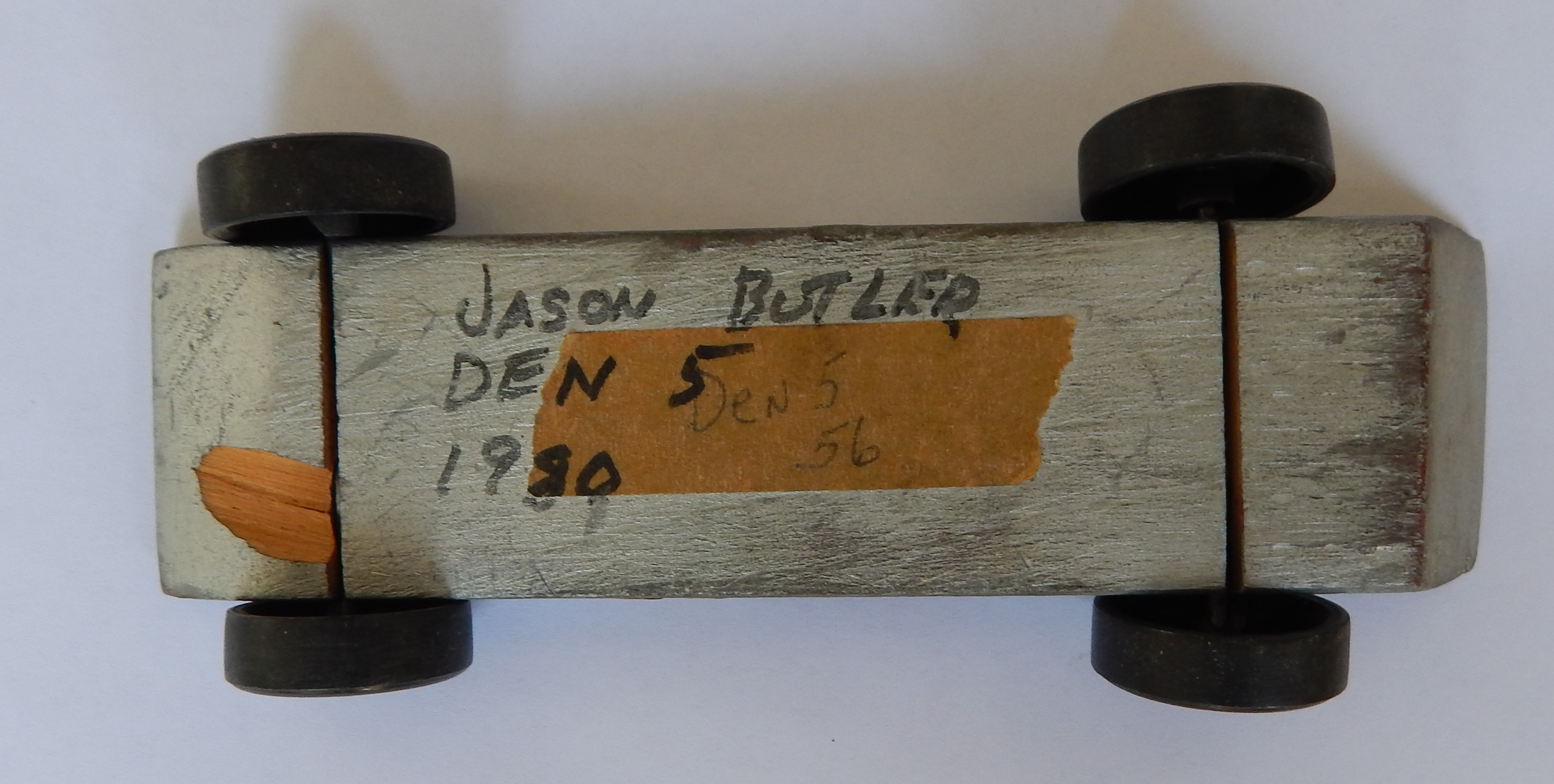 Tim ManasterskiKeymasterThis is a cub scouts pinewood derby racer, I know because I made one with my dad when I was in cub scouts in the 1980s! Jason Butler made this car (probably with help from his parents in 1980), I know this because they put his name and den number clearly marked on the bottom. BTW, I finished last place in the pinewood derby race (my dad didn’t know what grease to use on the wheels and whatever he used slowed it down, instead of speeding it up). It didn’t matter, I still had a great time with my dad and it was more about the time spent together than winning the race.