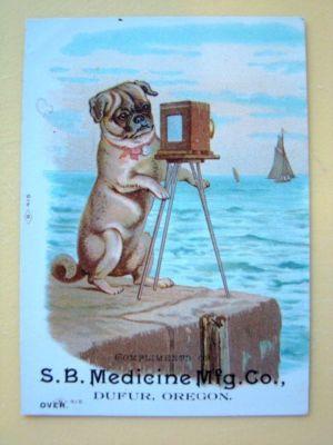Sweet Antique 1890 PUG DOG & CAMERA, S.B. MEDICINE Advertising Trade Card