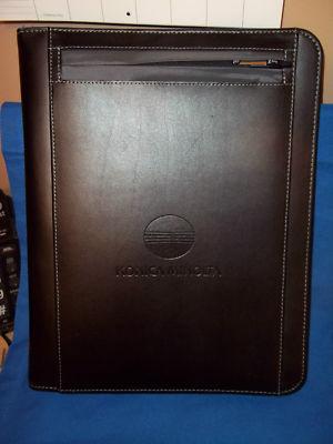 Konica Minolta logo leather zipper portfolio - embossed logo - made by Leeds