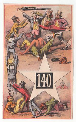 Peculiar trade card with men fighting over a Paragon 140 Water Proof Umbre [4017