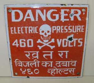 Original Vintage Danger 460 Volts Electric Pressure Porcelain Enamel Sign 6"
