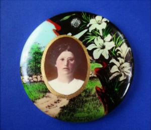 VINTAGE PHOTO CELLULOID POCKET HAND MIRROR BIRTHDAY FLOWER APRIL EASTER LILY