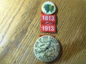 1913 PINBACK BUTTON / RIBBON & DISC HUB OF THE GRAPE BELT BROCTON,NY RIBBON TORN