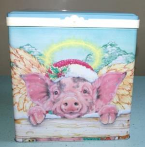 99 Olive Can Co Christmas Angel Flying Pig LRG Metal Tin Box Container Canister