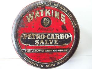 Vintage WATKINS PETRO-CARBO SALVE TIN {11 1/4ozs}--1/2 FULL