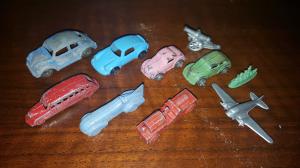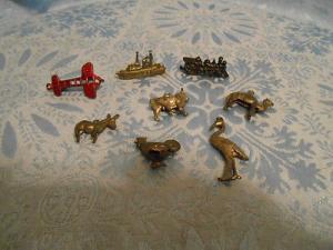 8 Neat Vintage Metal Cracker Jack Charms, Ship, Airplane, Train, Rooster etc.