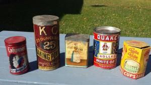 Lot Of 5 Kitchen Tins Etc KC Baking Power Cocoa Quaker Oats Betty Brite Calumet