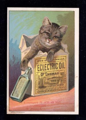 RARE 1870s FREEPORT IL ILLINOIS TRADE CARD - Dr Thomas - Cat in Box