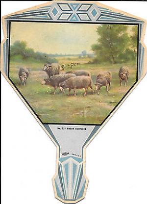 R. Atkinson Fox, Sheep, Meadow, Trees, Salesman Sample Hand Fan With Print 1920s