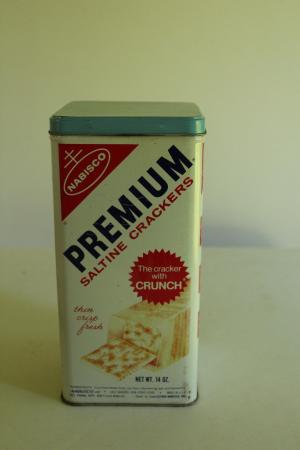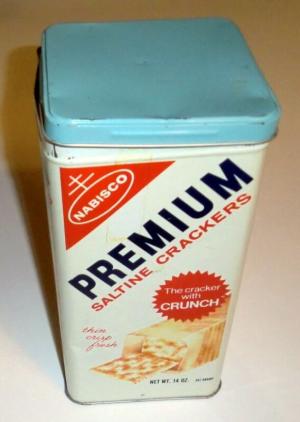Vintage NABISCO PREMIUM SALTINE CRACKERS 14 oz.Tin Can 1969 w/ Light Blue Lid