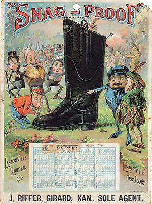 1896 VICTORIAN TRADE CARD FOR SNAG PROOF RUBBER BOOTS BY J. RIFFER GIRARD KS