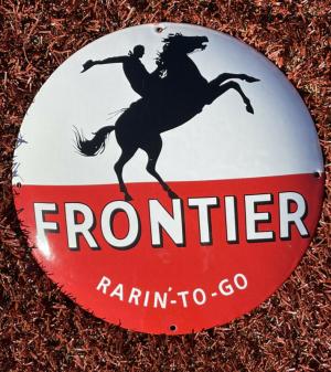 VINTAGE OLD FRONTIER PORCELAIN SIGN GAS OIL PUMP PLATE POWER MOTOR STATION RARE