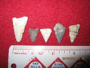5 ASSORTED MATERIALS TRIANGULAR POINTS ( NE END OF MUD LAKE, WISCONSIN )