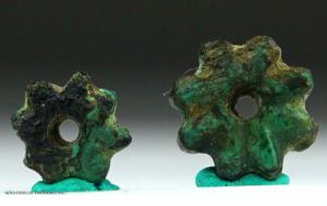 197) 2 Ancient Pre Columbian Moche Indian Malachite Stone Star Beads Artifact