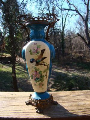 BEAUTIFUL SIGNED PORTRAIT VASE PORCELAIN ORNATE SPELTER FRAME - CLAW FEET