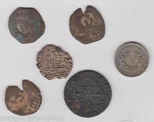 ( LOT of 5 ) SPANISH, COLONIAL PIRATE TIME COINS/COBS CENTER IS SILVER or BILLON