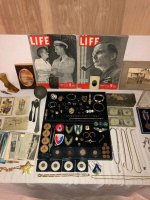 Antique Vintage Jewelry Coins Silver Military Medal Goldette NY Postcards Photos