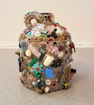 Folk Art style 6"H memory jug~100''s vtg charms,jewelry,buttons,toys~~newly made