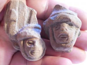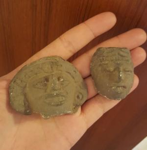 2 ANTIQUE FIGURINE-FACES-PRE COLUMBIAN-OLMEC POTTERY MASK?3 INCH-AZTEC?MEXICO?#O