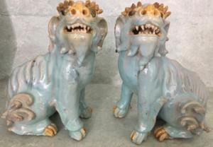 Pr Old Chinese Turquoise Like Porcelain Stoneware Foo Dogs Lions Shi Shi