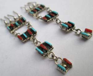 OLD ZUNI SIGNED Silver RED CORAL TURQUOISE Petit Point Earrings