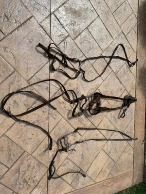 Vintage leather horse bridals and rope harnesses found in 100+ year old barn