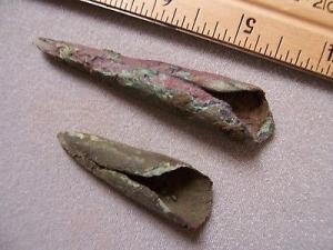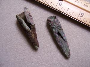 TWO AUTHENTIC OLD COPPER CULTURE CONICAL POINTS FROM THE JIM BUSSEY COLLECTION