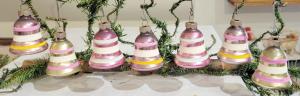 Seven Shiny Brite Bells. Assorted Colors Stripes. USA 1950