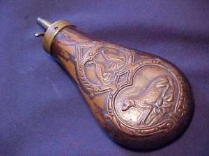 Vintage American Copper Powder Flask Horn Measure Copper Hunting Dogs