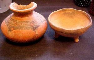 2 PRE-COLUMBIAN POTTERU PIECES 3 LEG BOWL & DAMAGED POT W/ DECORATIONS IN BLACK
