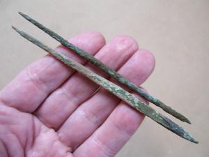TWO AUTHENTIC OLD COPPER CULTURE AWLS FROM THE GORDON MORRIS COLLECTION