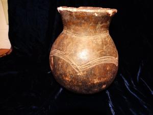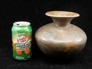 antique pre columbian brown glazed pottery pot incised decoration 9.5"