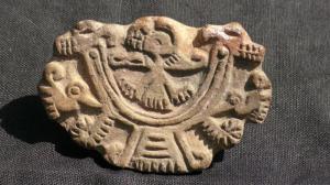 pre columbian la tolita Jama coaque zoomorphic pottery stamp w/ shaman+seabirds