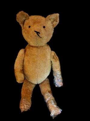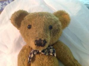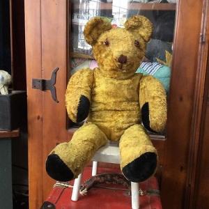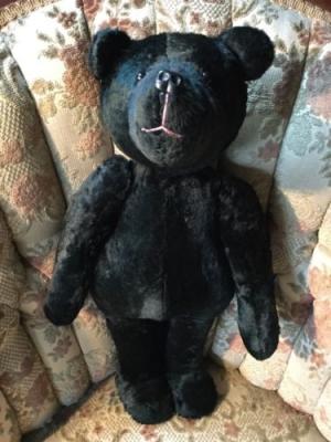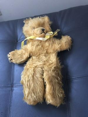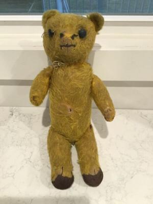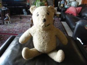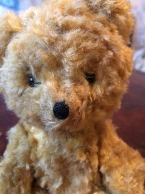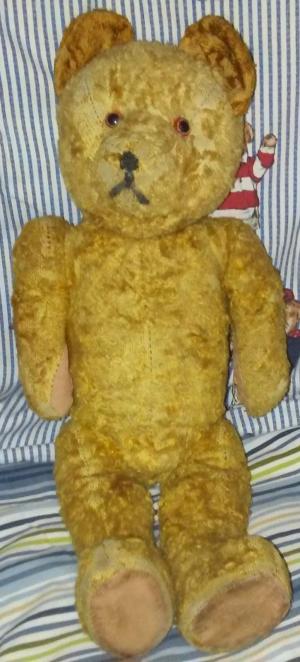| Max is a very dapper antique, vintage, old golden bear with black velvet pads |