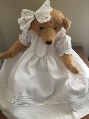 | Handmade Jointed Teddy Bear With Vintage Smocked Dress And Doily Hairbow.  18 In |