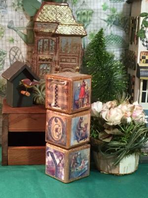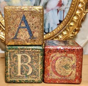 | OOAK HANDMADE 3 WOOD ALPHA BLOCKS,  ANTIQUE TEDDY BEAR CHRISTMAS THEME, SPARKLY |