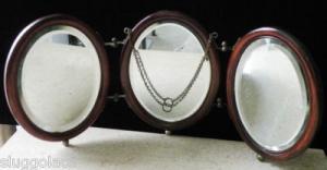 antique CHERRY 3-FOLD OVAL BEVELED VANITY MIRROR - table top or hang