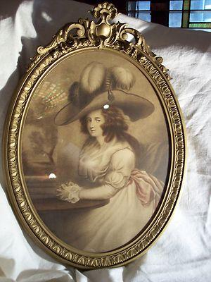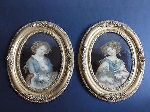 Pair Antique Ornate Gesso Oval Frame Victorian Women in Hats Print Gold