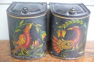 Pair of 2 Antique 19thC Pennsylvania Toleware Birds Painted on Tin Tea Bins
