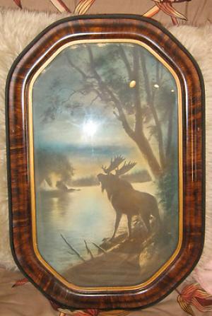 Antique Vintage Victorian Tiger Wood Bubble Convex Glass Picture Frame & Picture