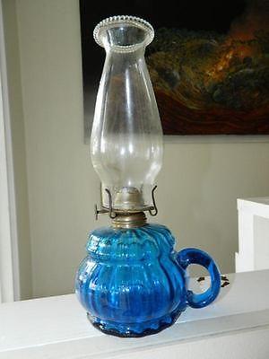Auction 4 Ribbed Blue Glass Finger Bedside Oil Lamp Eagle Burner USA c1900