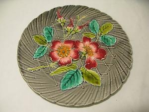 8 1/4" Colorful Brown Antique Majolica Floral Plate / Dish