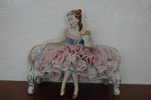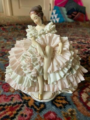 Beautiful Pink and White Dresden Lace German Figurine w/stamp - 6" high